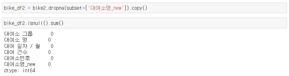 2) 대여소명_new이 None 인 값 확인 후 제거
