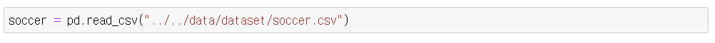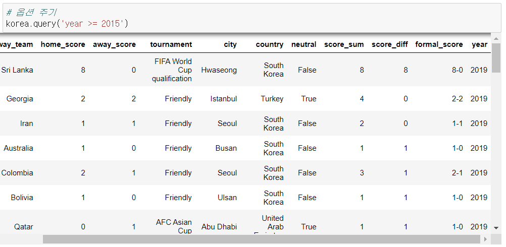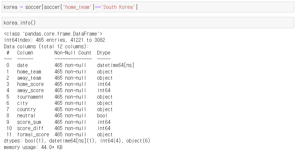 - home_team 이 우리나라인 데이터 추출 후 새로운 데이터 프레임 생성(korea)