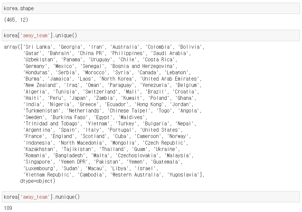 - 우리나라와 시합했던 국가명 추출 및 수 확인