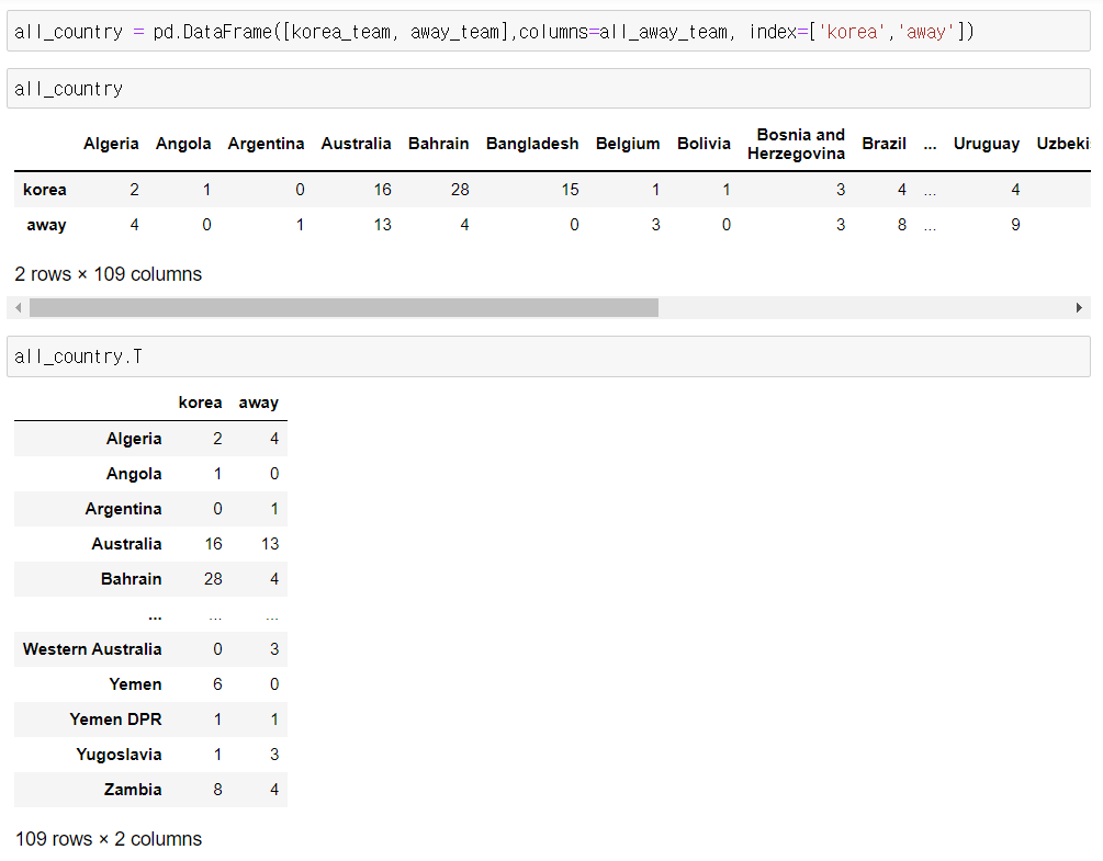 - 대한민국과 경기했던 국가명, 실점, 득점 리스트를 하나의 데이터 프레임 생성 => all_country