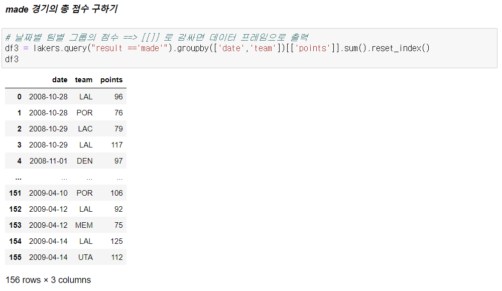 - 날짜별 경기 결과에서 result 컬럼의 value 가 made인 points만 더하면 총 점수