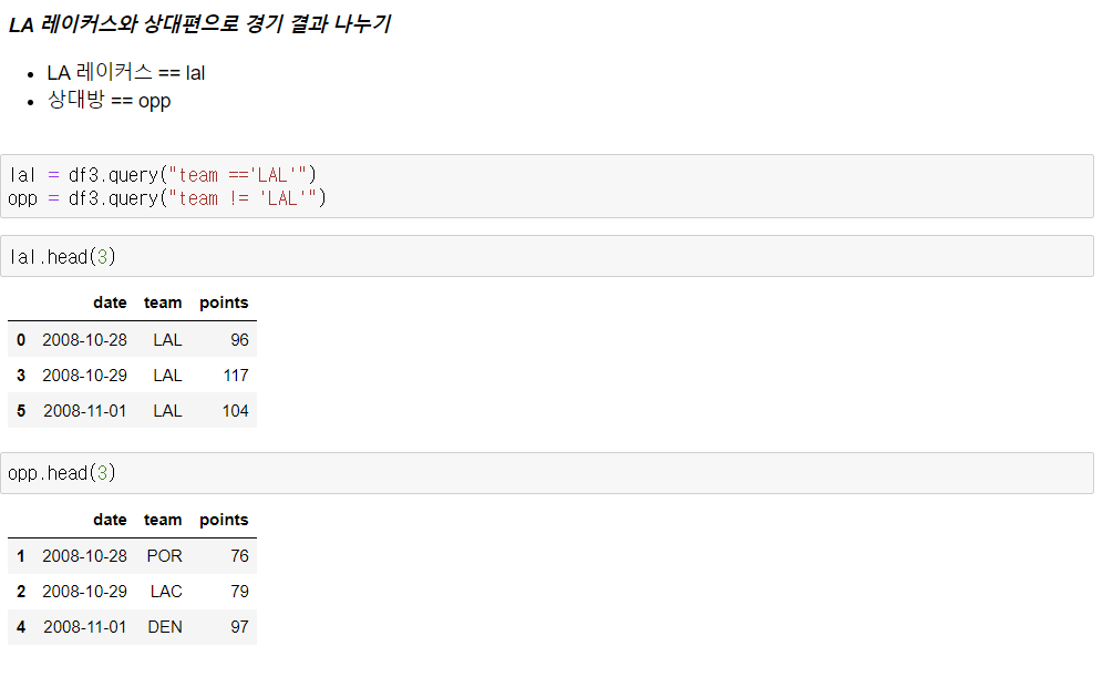 - LA 레이커스와 상대편으로 경기 결과 나누기