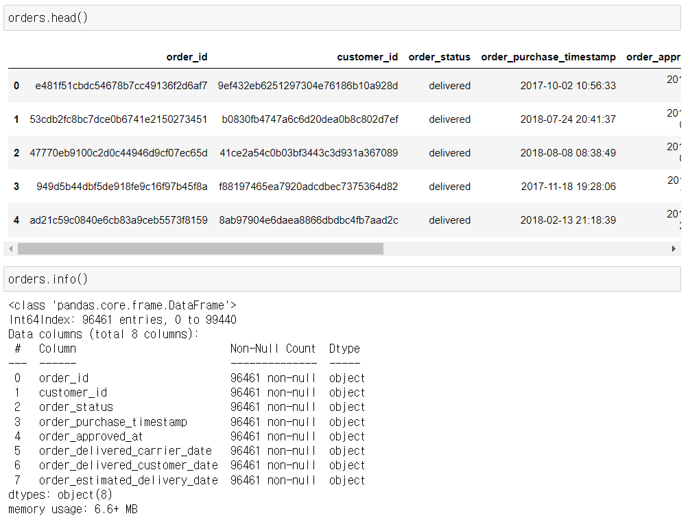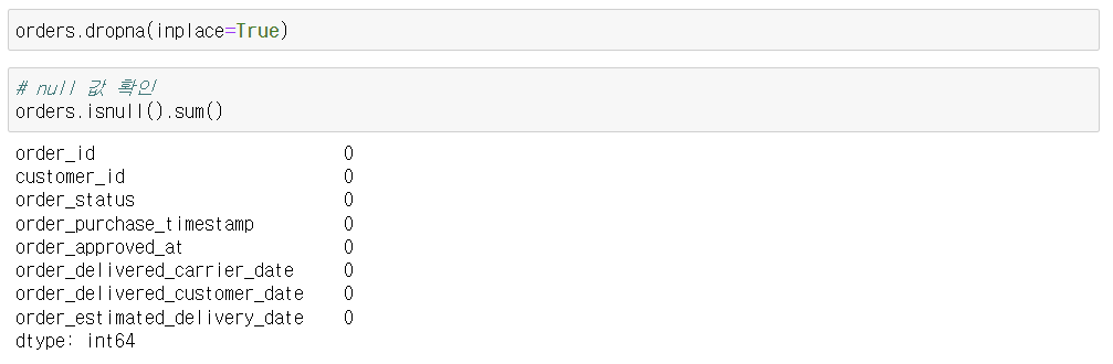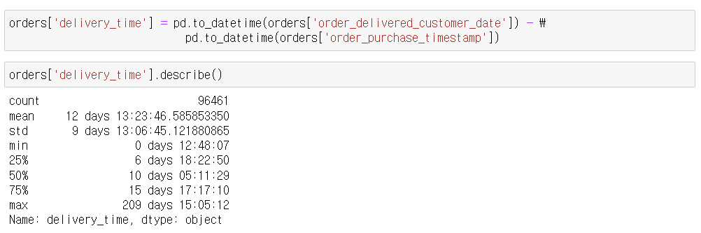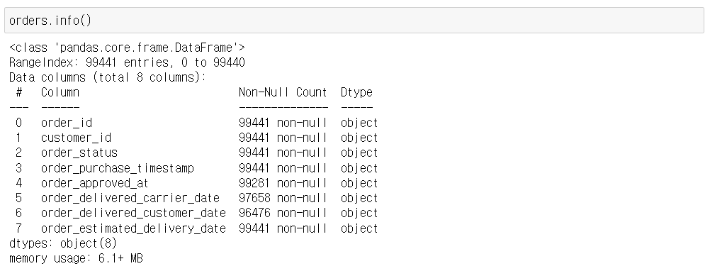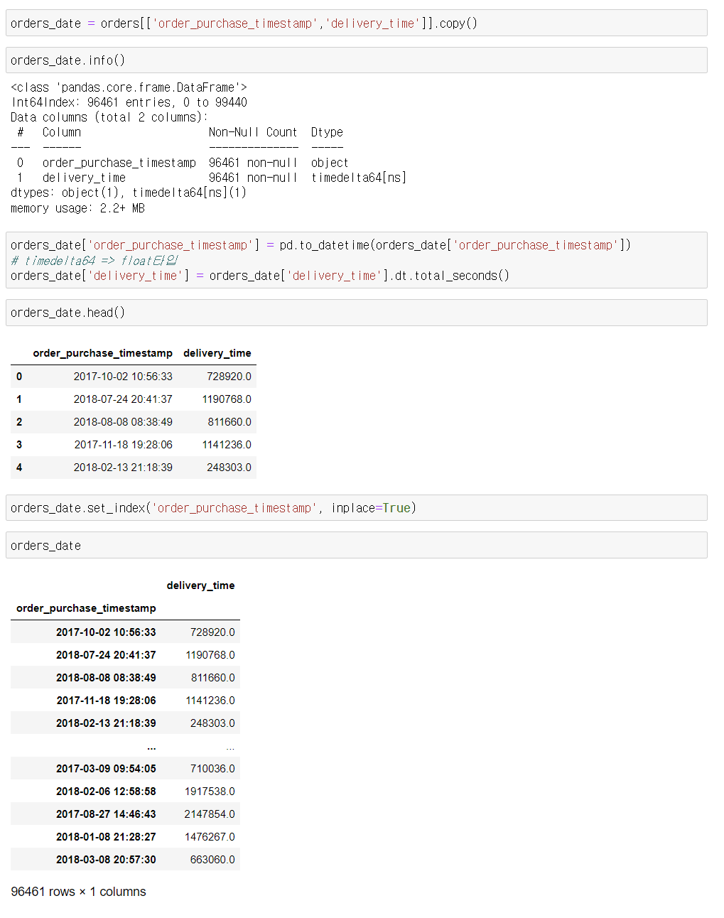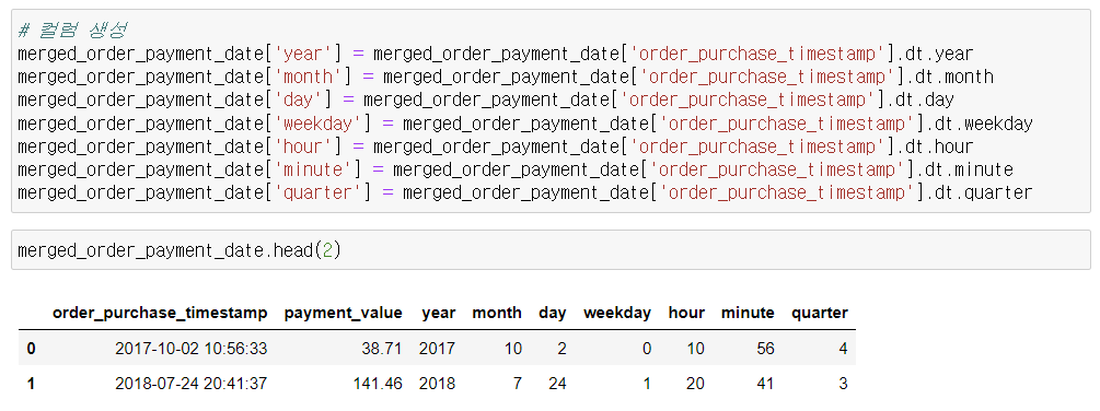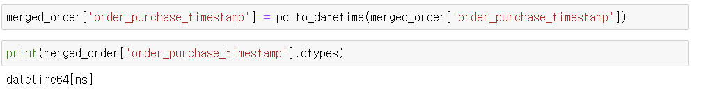 - order_purchase_timestamp ==> datetime 타입으로 변환
