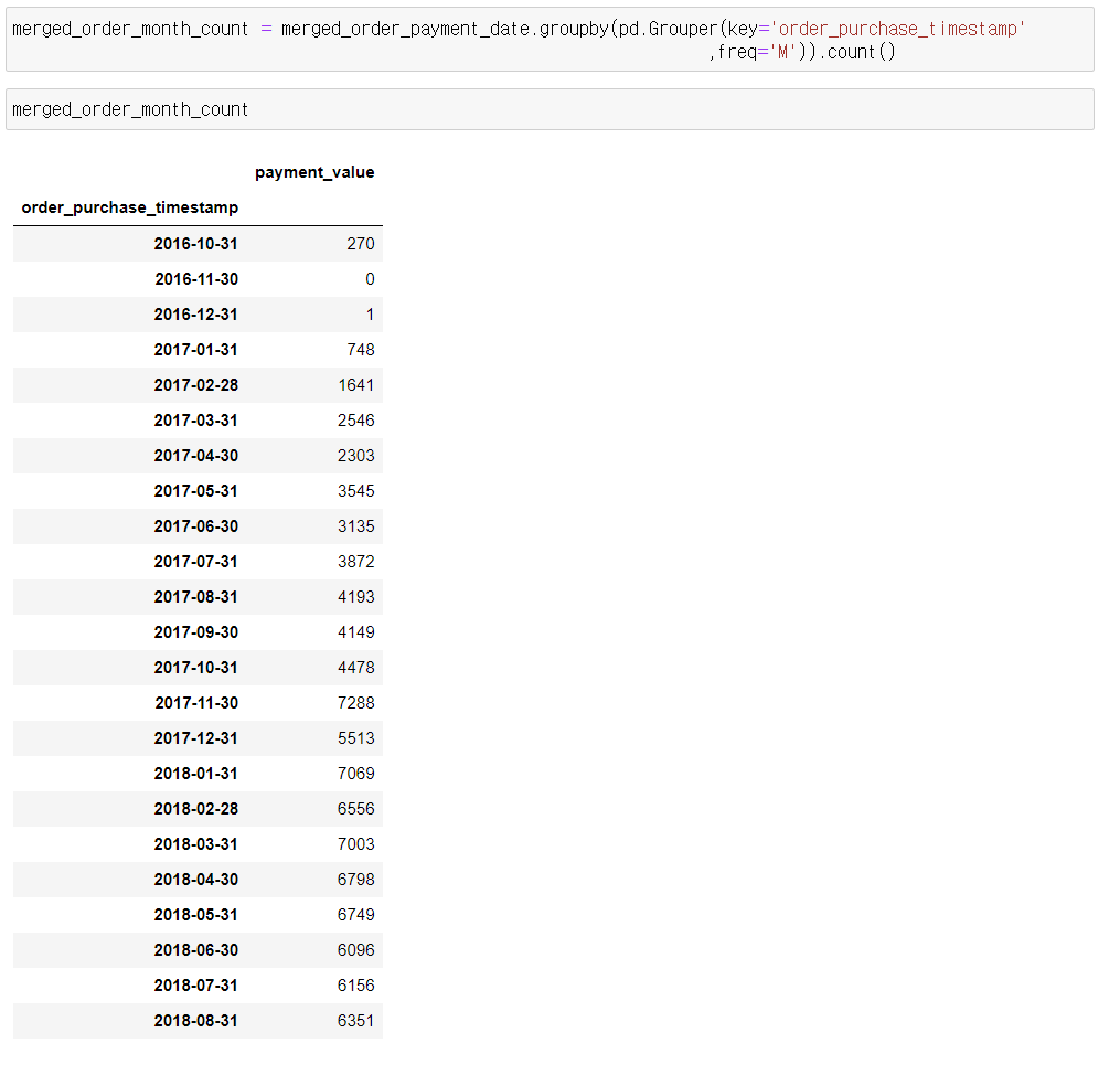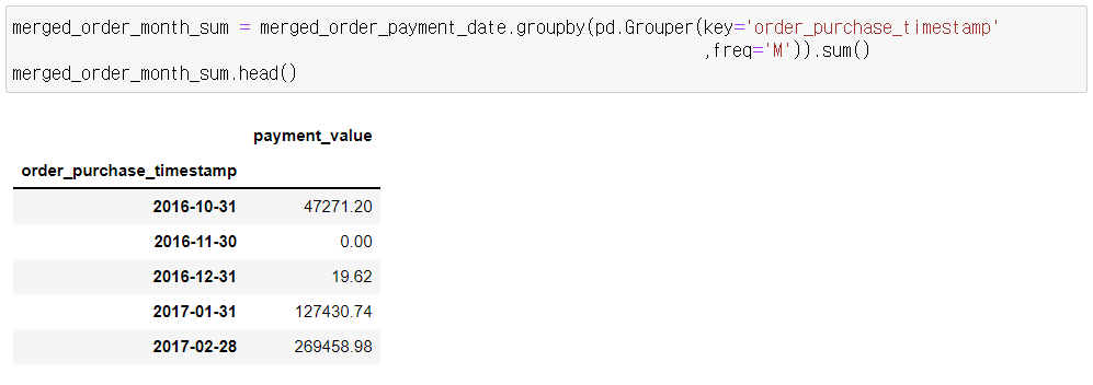 - Grouper(key='order_purchase_timestamp',freq='M')