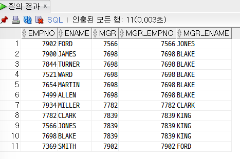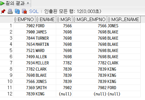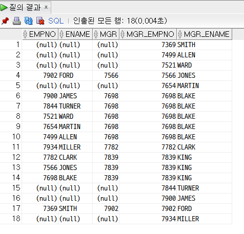 LEFT OUTER JOIN emp e2 ON e1.mgr = e2.empno;