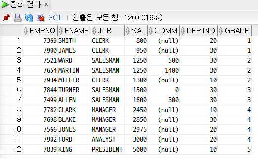 ※ 비등가 조인 : 값이 같진 않지만 일정 범위안에 들어있는 테이블을 연결