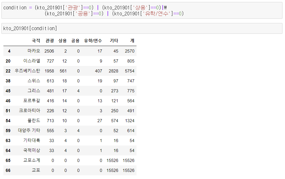 ※ 관광, 상용, 공용, 유학/연수 데이터 중에서 min 값이 0인 이유
