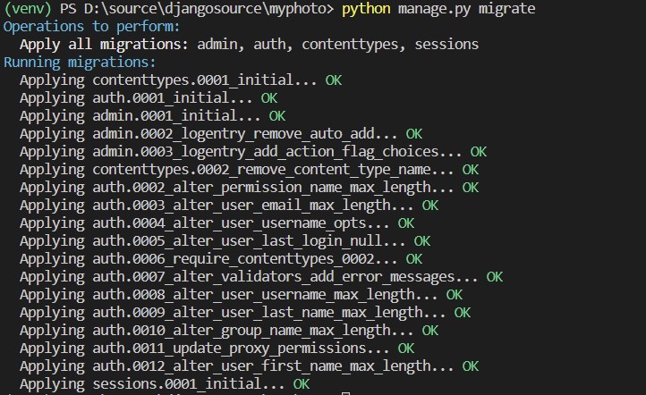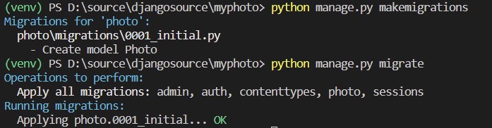 - (venv) PS D:\source\djangosource\myphoto> python manage.py migrate