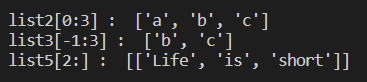 # ["Life", "is", "short"] 전체가 -1, 안에서 0,1,2,번 이라 short가 출력됨.
