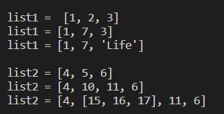 list6 = [1, 2, ["a", "b", ["Life", "is"]]]