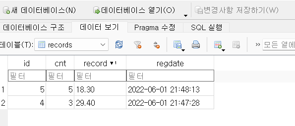 (id integer primary key autoincrement, cnt integer, record text, regdate text)