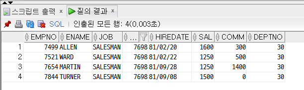 AND job = 'SALESMAN'; --salesman : 소문자로 입력시 조회가 안됨.
