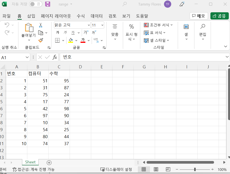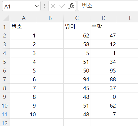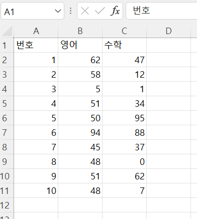 ws.append(["번호", "영어", "수학"]) # 가장 첫줄 타이틀 입력