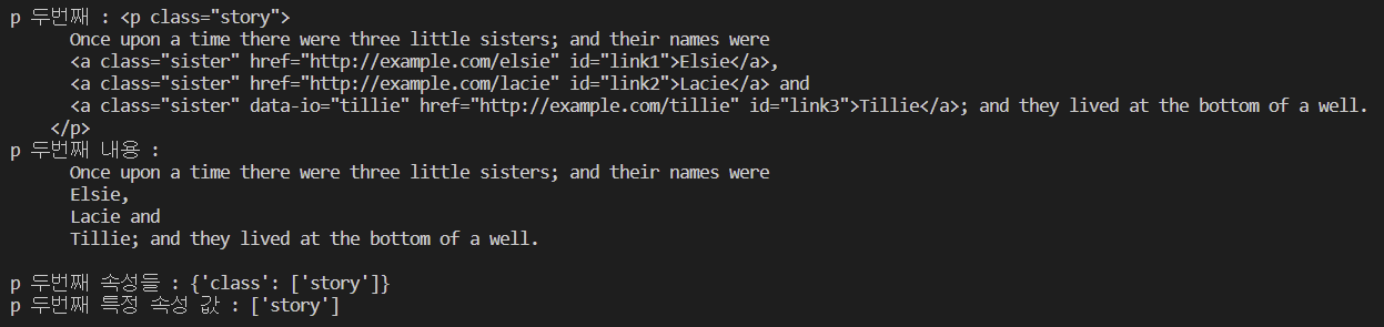 print(f"p 두번째 내용 : {p2.get_text()}") # p가 가지고 있지 않은 자식들이 가지고 있는 내용도 출력됨
