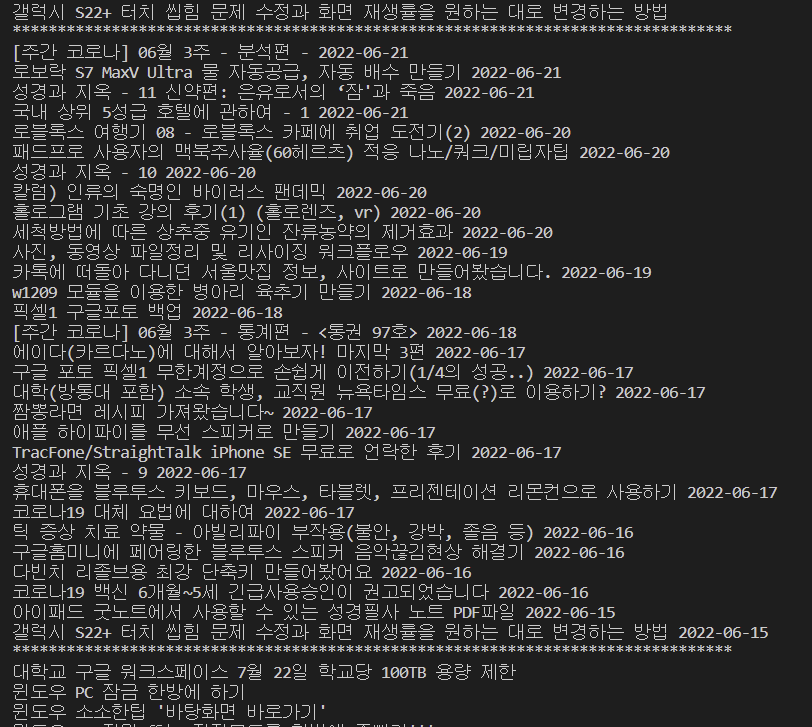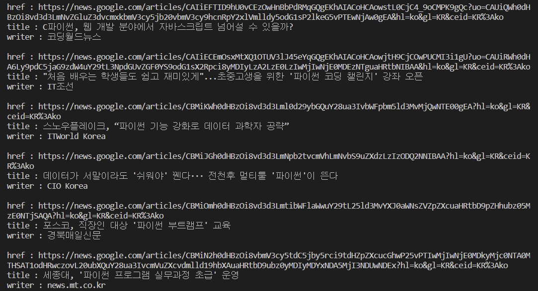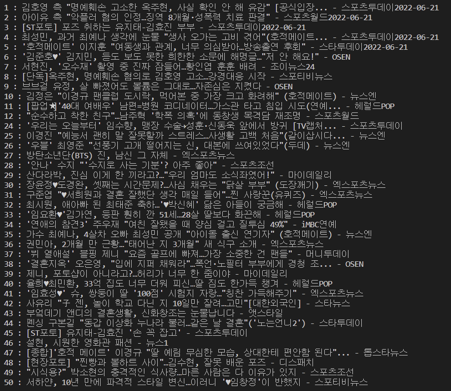 # print(article) # 개별로 뉴스 기사가 나오는지 확인