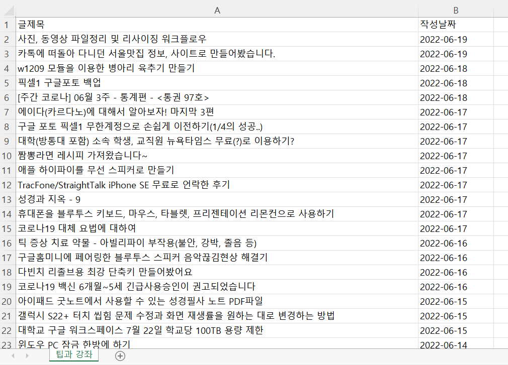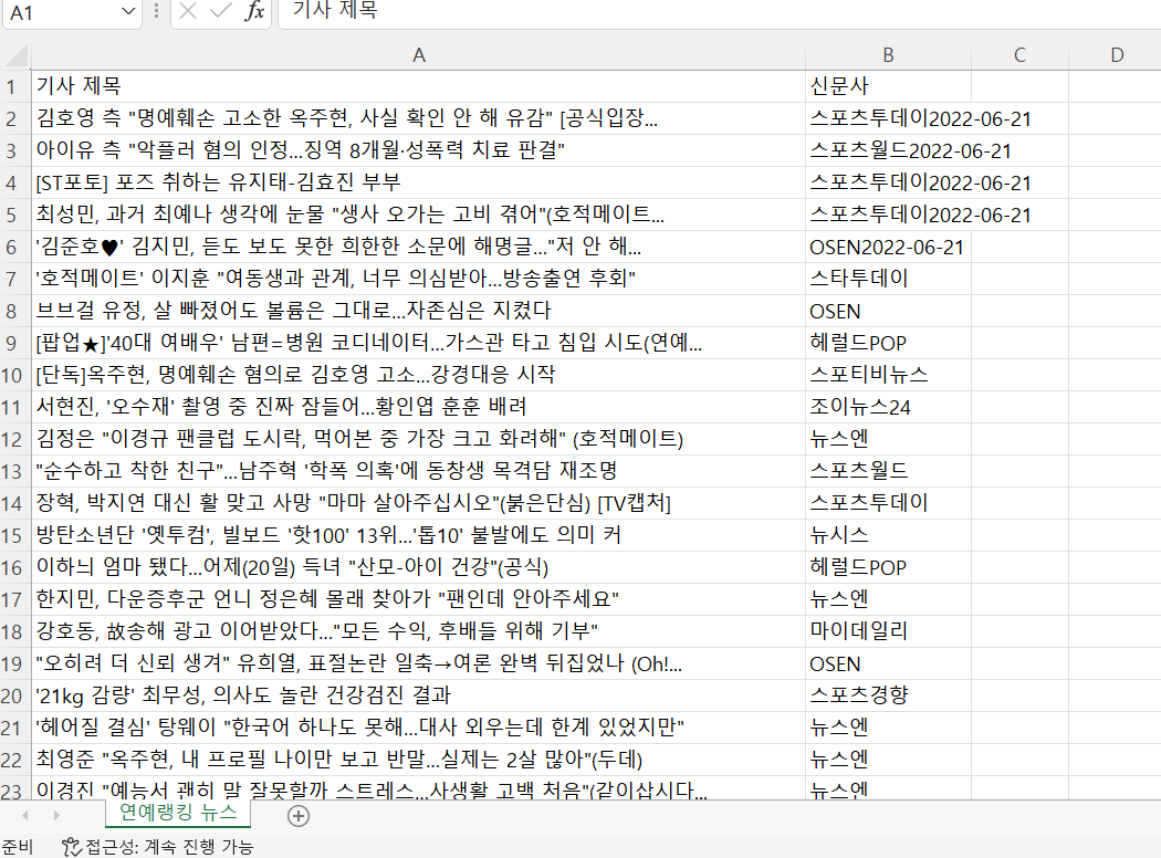 네이트 연예 랭킹 뉴스 크롤링 후 엑셀 저장