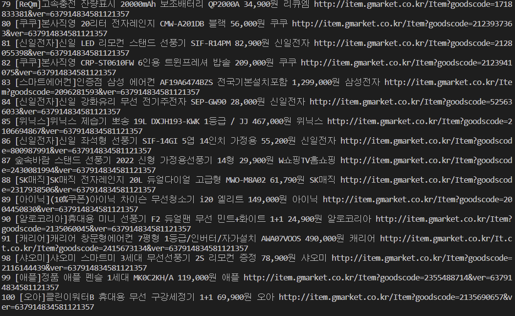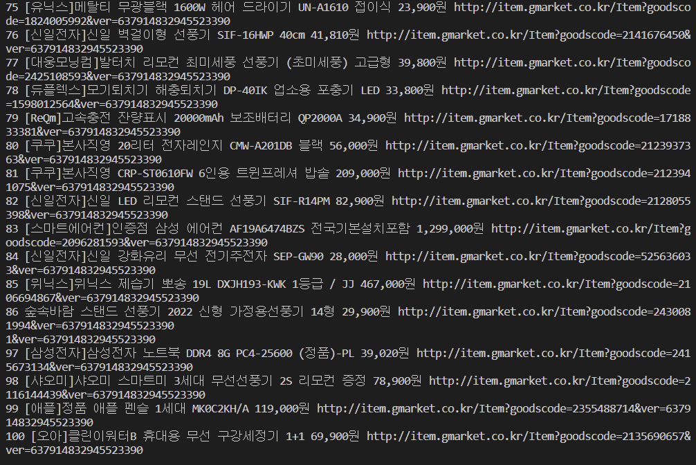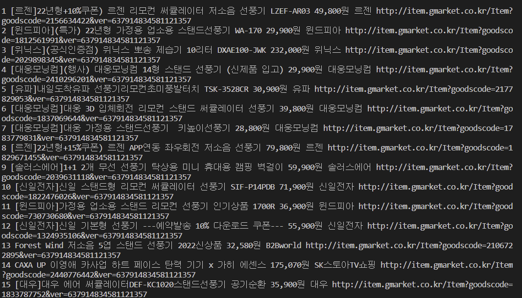 print(idx + 1, title.get_text(), price, company.get_text(), product_url) # 출력문