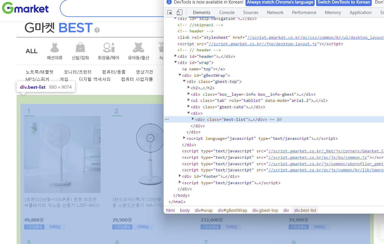 G마켓 best - 컴퓨터/전자 항목 추출 + 엑셀 저장
