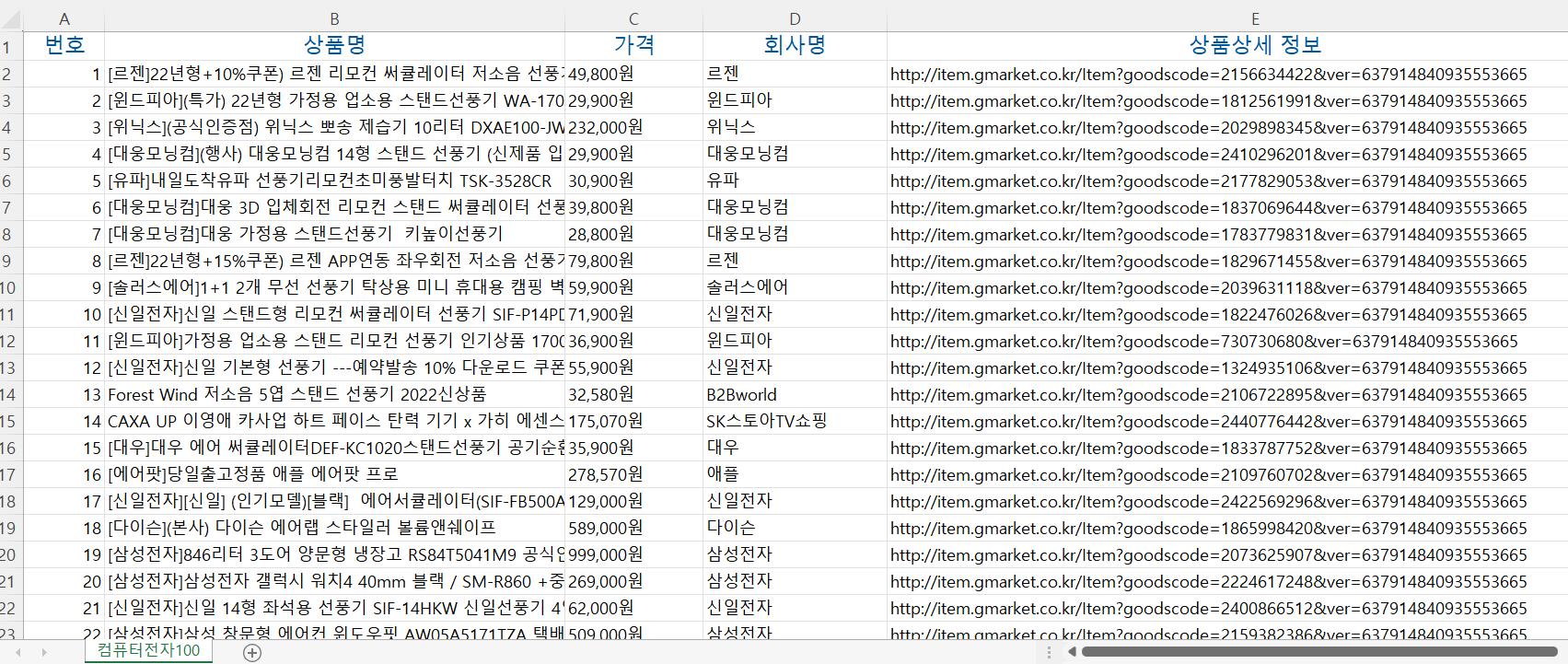 ws.append(["번호", "상품명", "가격", "회사명", "상품상세 정보"])