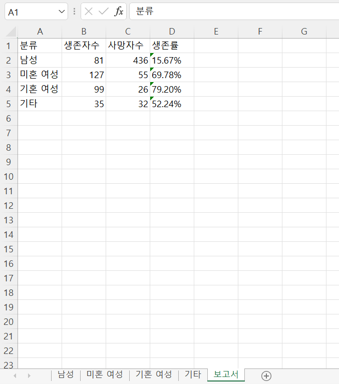 work_sheet_report.append(["분류", "생존자수", "사망자수", "생존률"])