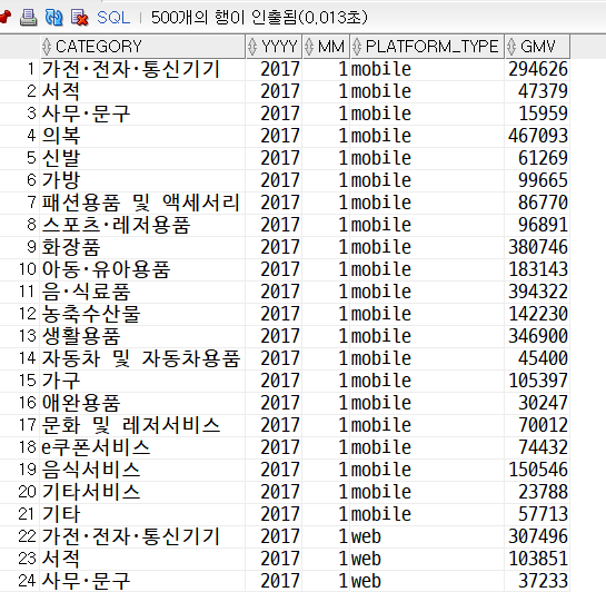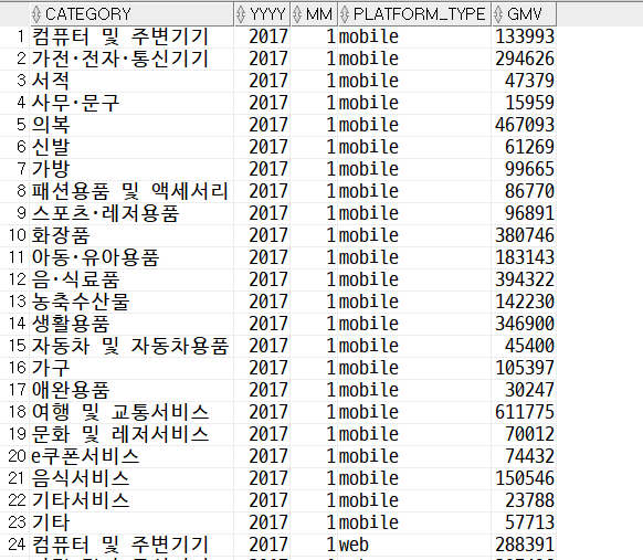 1) category가 '여행 및 교통 서비스' 인 매출액
