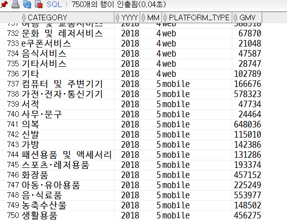 4) category가 ' 여행 및 교통서비스' 이거나 '컴퓨터 및 주변기기'가 아닌 매출액
