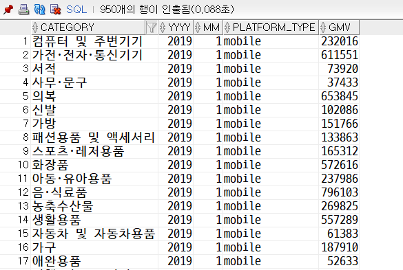 2) category가 '여행 및 교통 서비스'가 아닌 매출액
