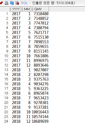 4) 연도가 2018년이고, gmv가 100,000보다 작고, gmv가 10,000보다 큰 매출(단위: 백만원)