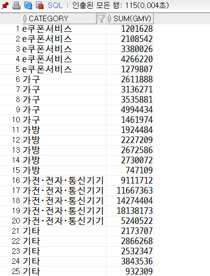 1) 특정 매출액(카테고리 - 50,000,000) 이상 카테고리 추출