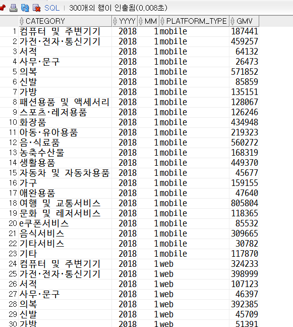 3) 연도가 2018이거나 category 명이 '컴퓨터 및 주변기기' 매출액
