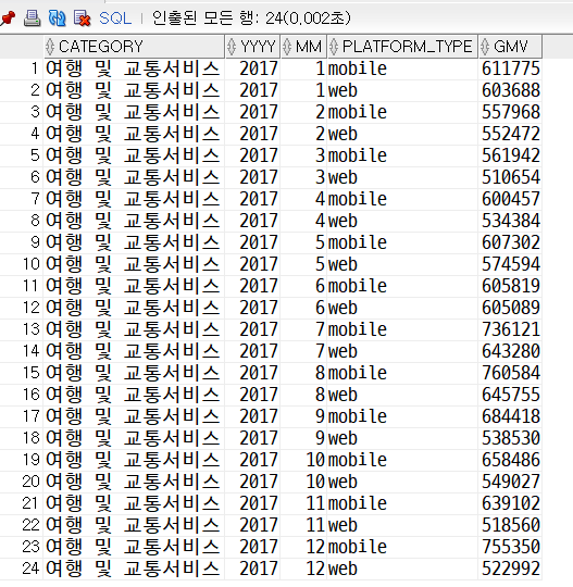 1) 2017년도의 '여행 및 교통서비스' 카테고리 조회
