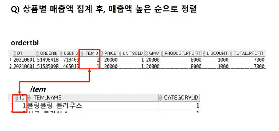 3) 상품별 매출액 집계 후 매출액 높은 순으로 정렬