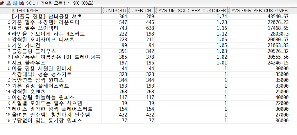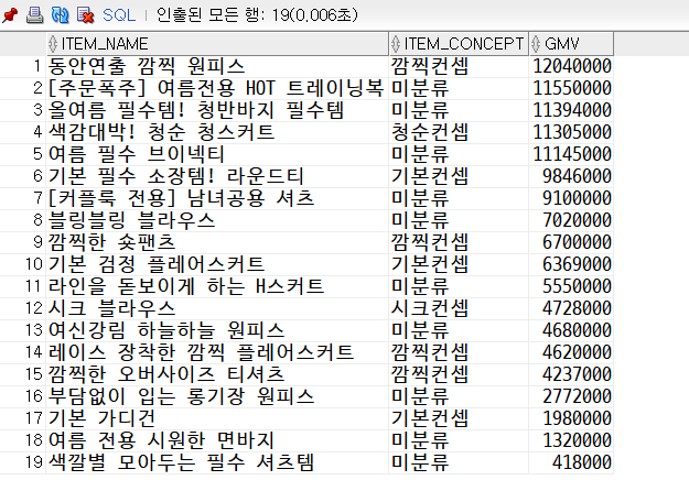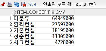 - 시크, 깜찍, 청순, 기본 키워드별 상품 분류 후 매출 조회