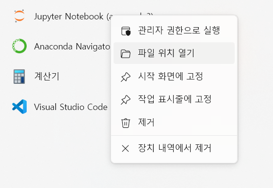 파일 위치 열기 - 설치된 폴더로 연결