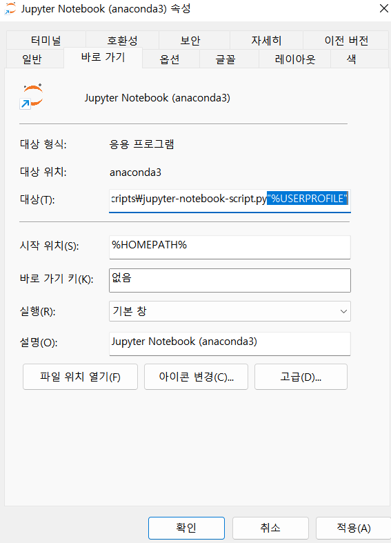 대상(T) : 제일 끝 부분 "%USERPROFILE" 삭제