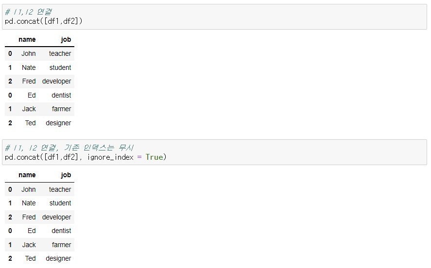 - pd.concat([데이터프레임1, 데이터프레임2])