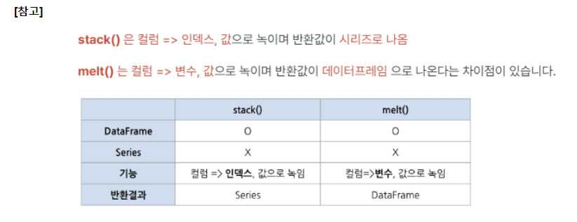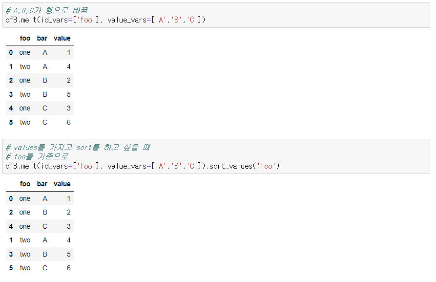 pivot 이 적용된 데이터 프레임을 melt를 써서 처음과 유사하게 만들어보기