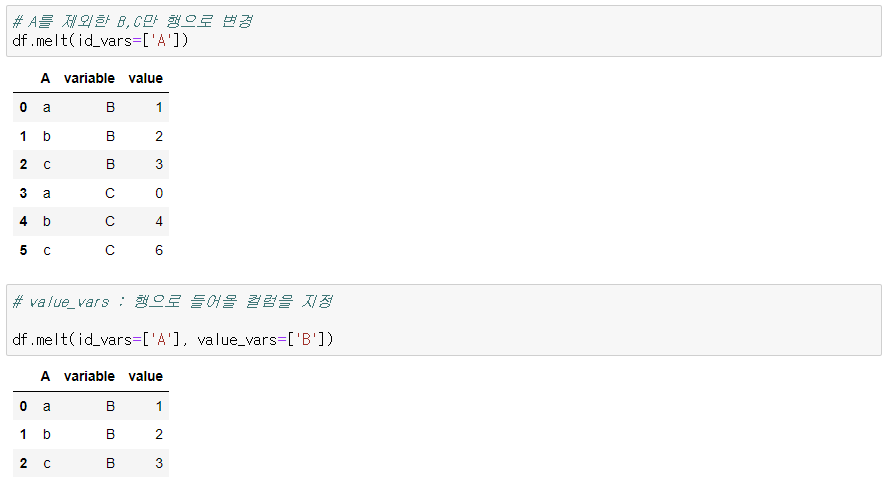 - 1 개 이상 열들을 식별자 변수 형식으로 재형성