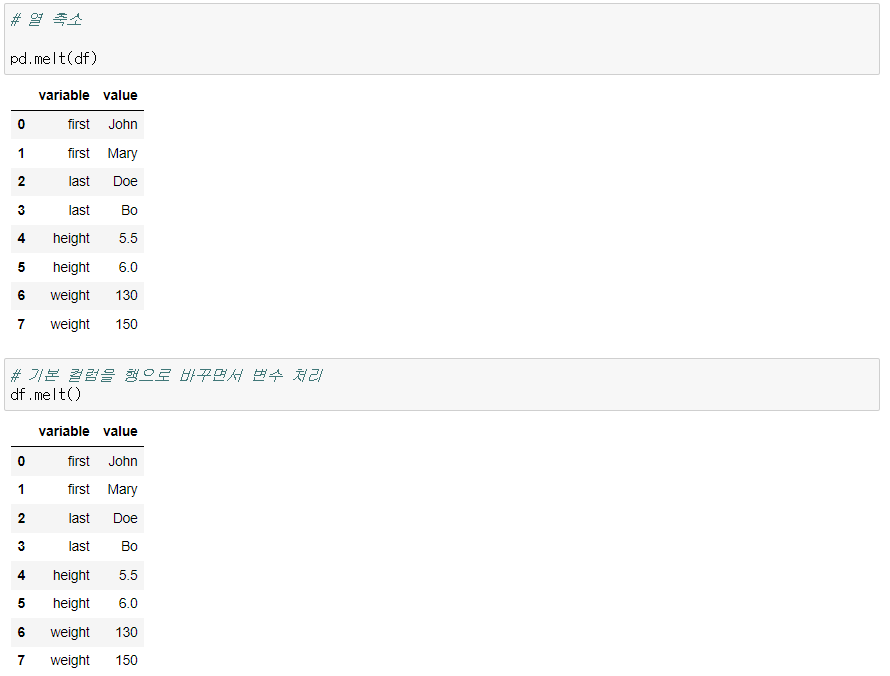 1) 모든 컬럼을 행으로 녹여냄(열 축소, 행 확장)