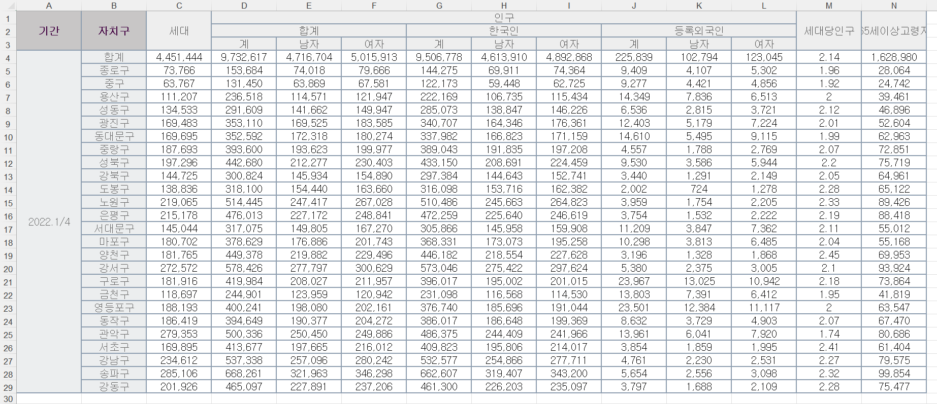 - '구 별', '총 인구','한국인','외국인','고령자'