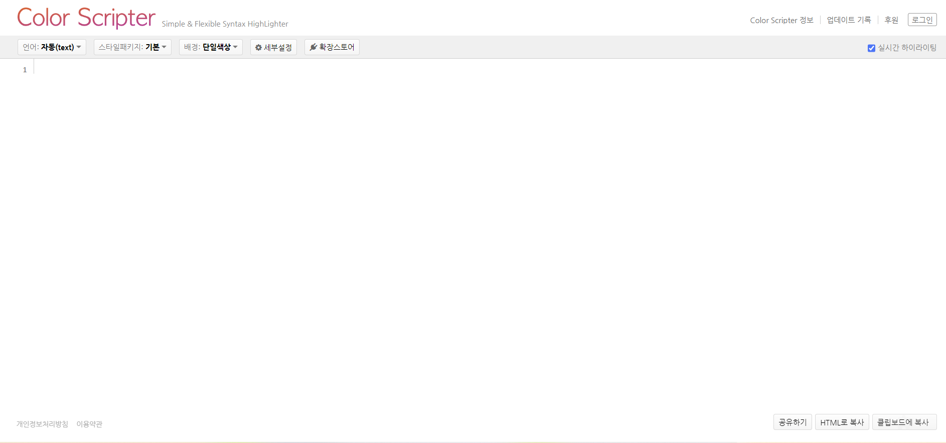 본격 자바 블로그를 작서하려고 하니 소스 코드를 어떻게 넣어야하나 고민하고 구글링 해 본 결과 많은 사람들이 컬러스크립터를 사용하고 있었어요. 간단하고 무료라 인기가 많아요! 로그인 없이도 사용 가능합니다.