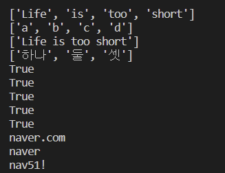 # split() : 문자열 나누기. 리스트 구조로 리턴(자바에선 배열). default:공백을 기준으로 나눠줌