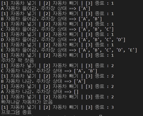 no = int(input("[1] 자동차 넣기 | [2] 자동차 빼기 | [3] 종료 : "))
