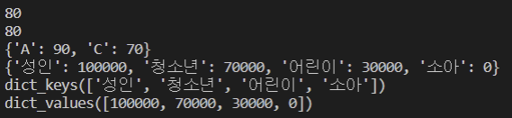 # dict2 생성 ==> '성인' : 100000, '청소년':70000, '어린이':30000