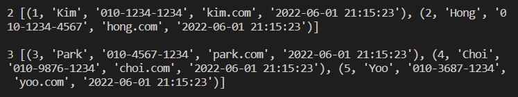 print("2", cursor.fetchmany(size=2)) # 리스트 구조로 출력. 개별 행은 tuple.