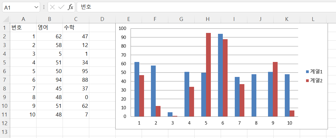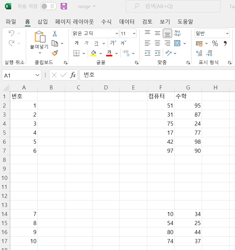 ws.append(["번호", "영어", "수학"]) # 가장 첫줄 타이틀 입력