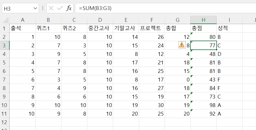 - H열에 총점(SUM 이용), I열에 성적 정보 추가