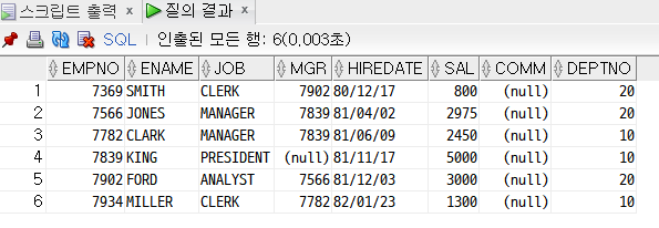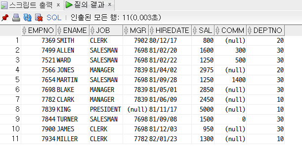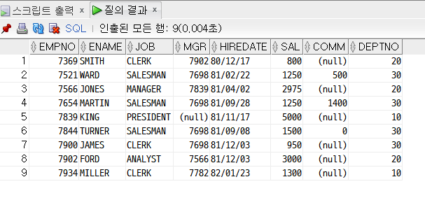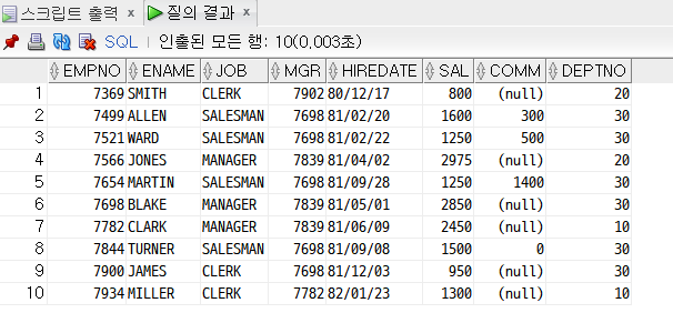 9) IN 사용해서 부서번호가 10, 20번인 사원 조회