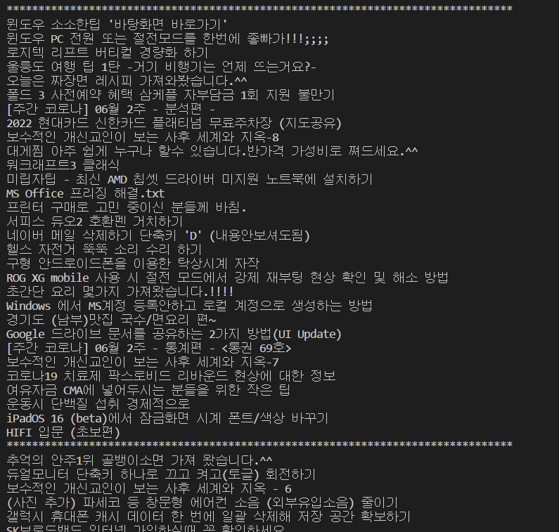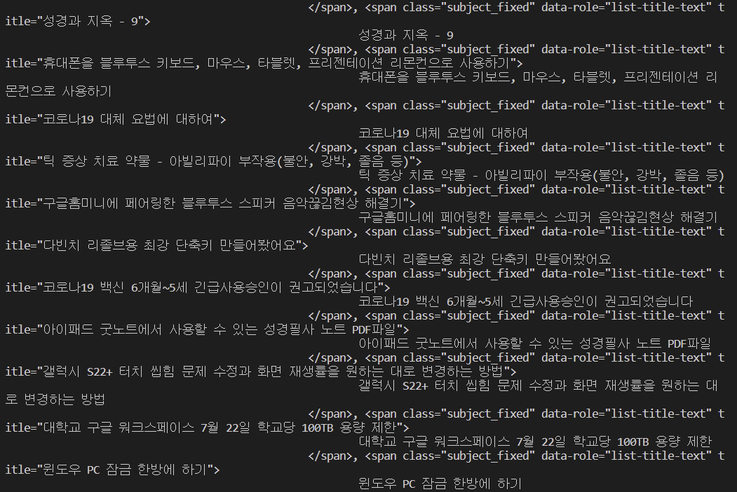 title_list = soup.select(" a.list_subject > span.subject_fixed")