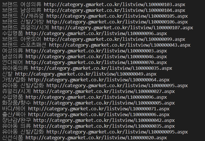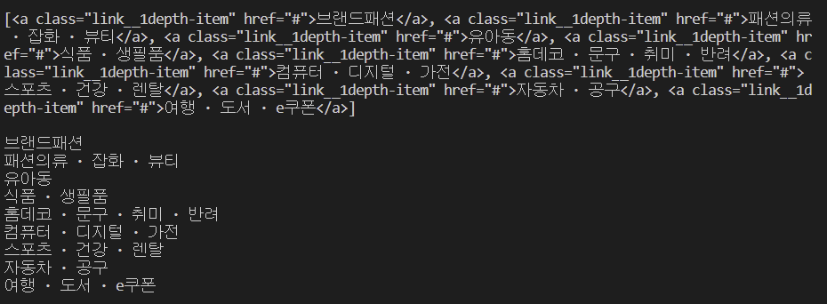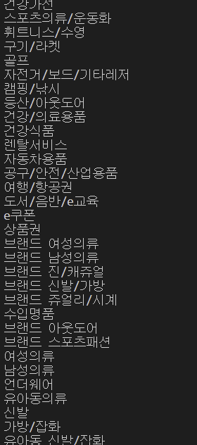 print(one_depth) # 자료확인. 반복으로 2번 나와서 카테고리 9개만 출력